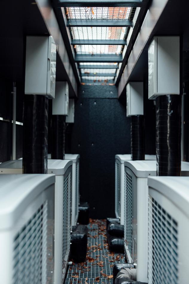 In dem Kölner Energie-Container arbeiten sechs tecalor Luft-Wasser-Wärmepumpen des Typs TTL 12.6, die in einer Kaskade zusammengeschaltet sind. Gemeinsam kommen die Geräte auf eine Gesamtleistung von rund 90 kW und nutzen dafür kostenfrei verfügbare Umweltenergie aus der Umgebungsluft. Ihre Wärme leiten sie in einen ebenfalls in dem Container integrierten 1.000-Liter Pufferspeicher. Dabei arbeiten die Wärmepumpen modulierend und passen somit ihre Leistung an den tatsächlich bestehenden Wärmebedarf des Mehrfamilienhauses an.