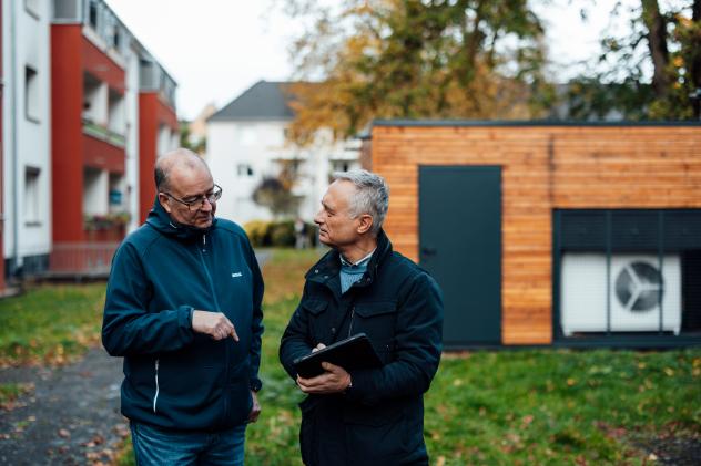Höhl: „Auch der Stromanschluss und die Steuerung sind vorinstalliert.“ Der Container passe auf einen LKW und müsse vor Ort nur noch in Betrieb genommen werden. Dank intelligenter Steuerung ist außerdem eine Fernwartung der Anlage möglich. „Für uns als Wohnungs-Genossenschaft ist es wichtig, über etwaige Ausfälle oder Fehler im System schnell und unkompliziert Bescheid zu wissen. Die Funktion der Fernwartung erleichtert uns daher das Objektmanagement ungemein“, betont Stefan Mies. „Die Wärmepumpen sind so kaskadiert, dass alle die gleiche Laufleistung haben“, so Holger Höhl. So ist auch die zu erwartende Lebensdauer der Anlagen identisch. Sollte dennoch einmal eine der Wärmepumpen einen Defekt haben, lässt sie sich separat reparieren oder austauschen, ohne dass den Bewohnern etwas auffällt.